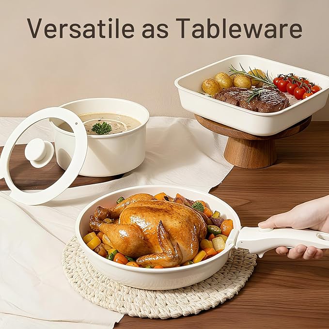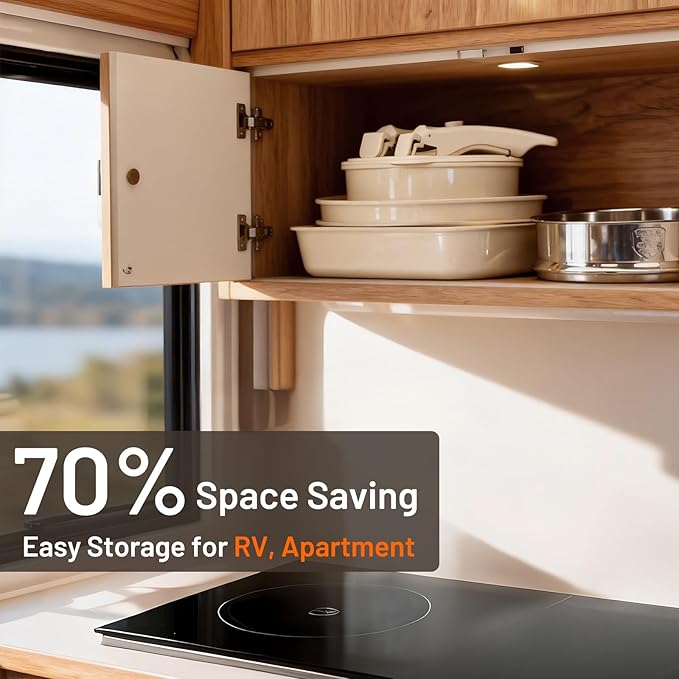 - 【STACKABLE WITH REMOVABLE HANDLE】Our detachable handle pots and pans is upgraded with better grip and an ultra-tight lock—even when lifting a pot full of soup, it stays completely stable without wobbling for safer use. Easy to organize and stack in cabinet or drawer - 70% Space saving for RV or Apartment small kitchen.