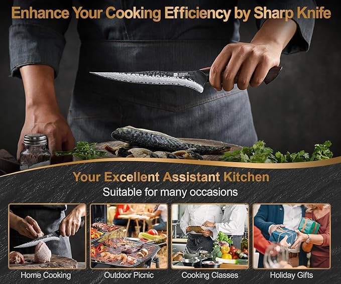• Perfectly Sharp Blade:Features a traditional handmade wet-cutting technique with V-sharpening and a 15-degree cutting angle on each side. Its thin, sharp blades glide effortlessly through ingredients, providing an incredibly smooth and precise cutting experience. Easily slice, debone, trim, peel, and butterfly various types of meat and fish.