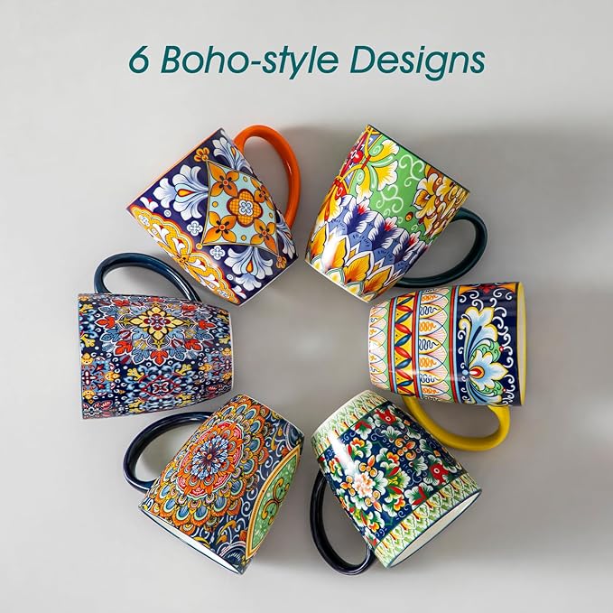 • 【Bohemian Coffee Mugs】This ceramic mugs set includes six 12 oz cups (4"H x 4.9"W with handle) featuring unique boho patterns, perfect for coffee, tea and gift giving