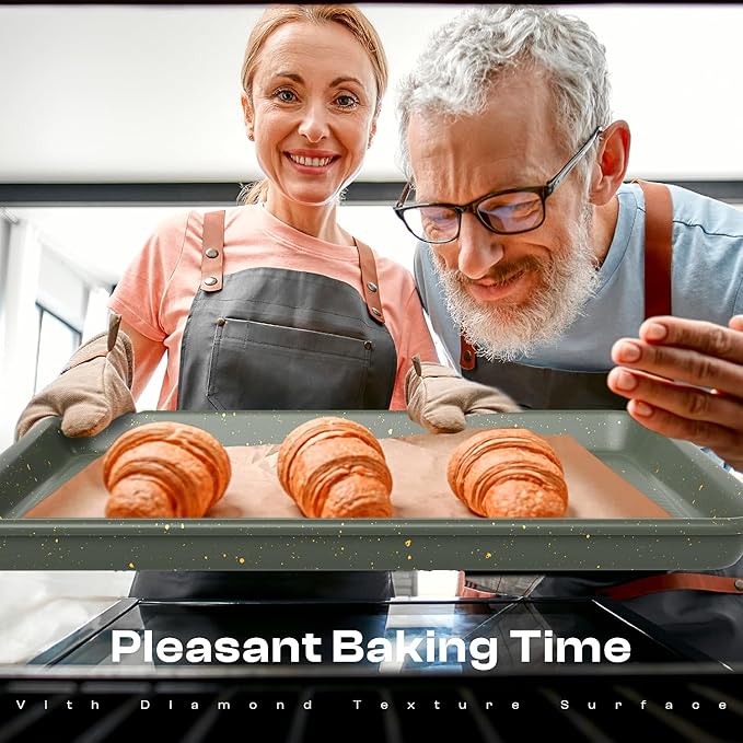 • Carbon Steel Construction: Crafted from 57% thickened carbon steel for lasting durability, this baking pan set is PTFE, PFAS, and PFOA free. It resists warping at temperatures up to 428°F, ensuring perfect baking results every time