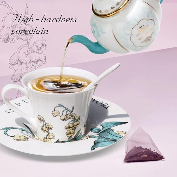 • Unique and creative design: The designer uses the lily of the valley flower pattern design, which means the return of happiness, the tea cups pattern is exquisite, each cup has a capacity of 7 ounces, with a spoon, easily stirred, and enjoy a leisurely time.