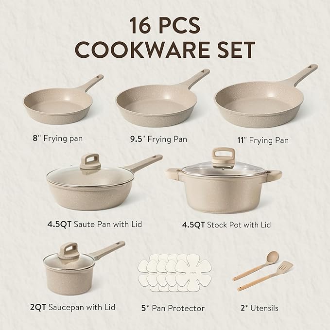 CAROTE 16 Pcs Pots and Pans Set Nonstick, Induction Kitchen Cookware Sets, Non Stick Kitchen Cooking Set with Frying Pans Set