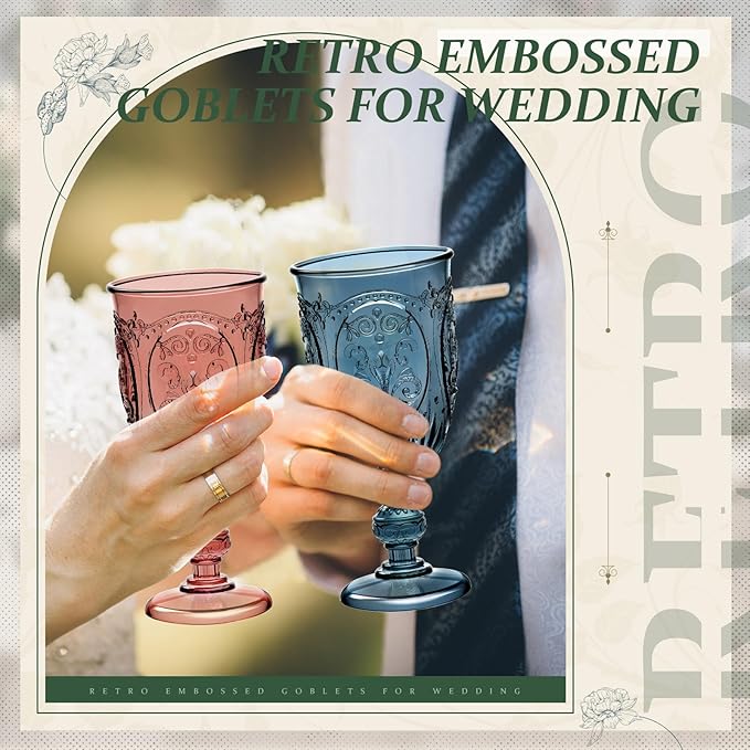 • Quality Material: the embossed wine glasses are made of plastic material, sturdy and lightweight, not easy to break or deform; Easy to clean, just rinse with warm water, and it will still remain bright even after a long time of cleaning, suitable for outdoor wedding receptions, anniversary parties, and everyday use