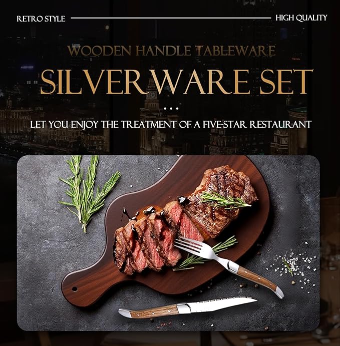 - 【Wooden Handle Tableware Set】 A steak knife silverware set made of genuine wood. It features natural wood grain handles adorned with rivet decorations, embodying an interpretation of American retro style. This flatware set includes a steak knife, main course fork, and main course spoon.