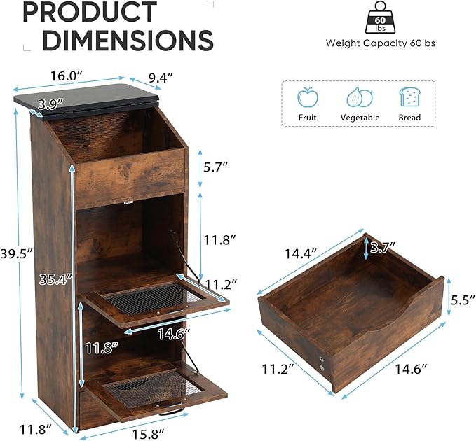 • Sturdy and Easy to Assemble: Overall dimensions: 16.0"L x 11.8"W x 39.5"H. Made of high-quality particleboard, this potato storage cabinet boasts a sturdy and stable structure while remaining easy to assemble. It comes with clear instructions and all the tools needed for installation. All parts are labeled, allowing you to complete the assembly quickly and easily.