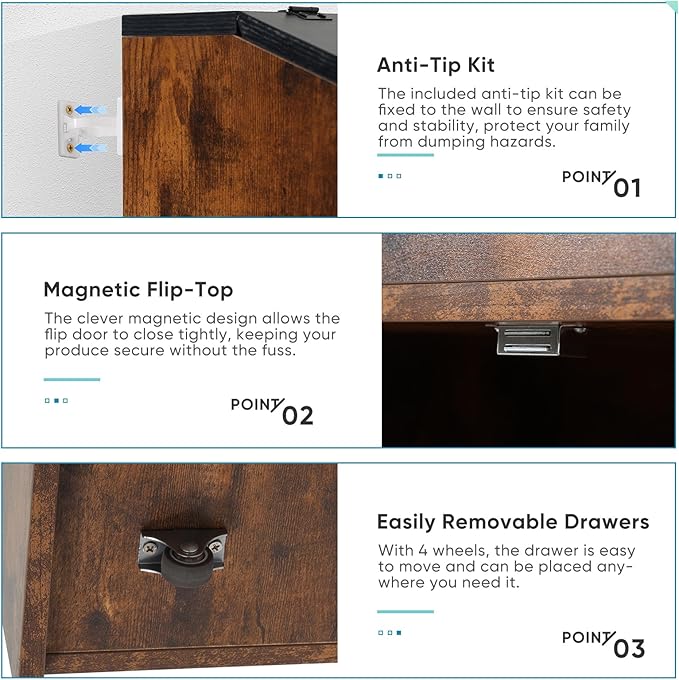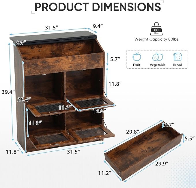 • Sturdy and Easy to Assemble: Overall dimensions: 31.5"L x 11.8"W x 39.4"H. Made of high-quality particleboard, this potato storage cabinet boasts a sturdy and stable structure while remaining easy to assemble. It comes with clear instructions and all the tools needed for installation. All parts are labeled, allowing you to complete the assembly quickly and easily.