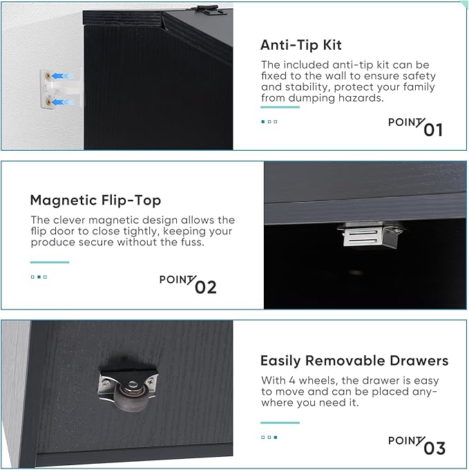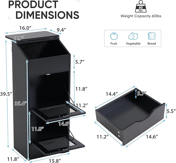 • Sturdy and Easy to Assemble: Overall dimensions: 16.0"L x 11.8"W x 39.5"H. Made of high-quality particleboard, this potato storage cabinet boasts a sturdy and stable structure while remaining easy to assemble. It comes with clear instructions and all the tools needed for installation. All parts are labeled, allowing you to complete the assembly quickly and easily.