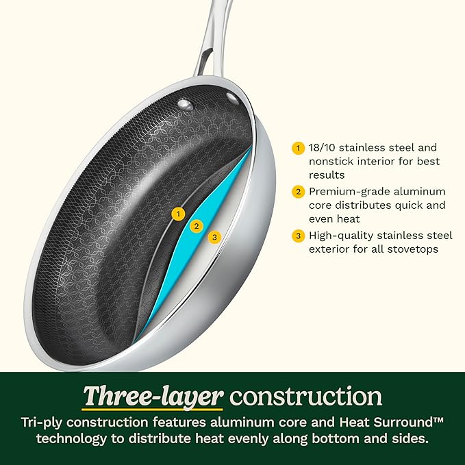 • THREE-LAYER CONSTRUCTION: Each stainless steel frying pan features Tri-ply construction with aluminum core and Heat Surround technology to distribute heat evenly along the bottom and sides of the skillet cookware.