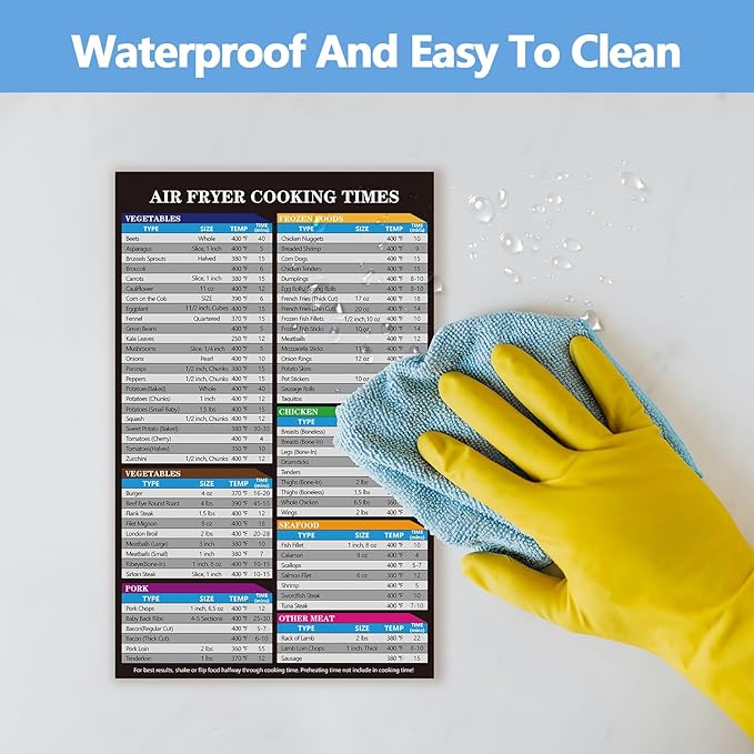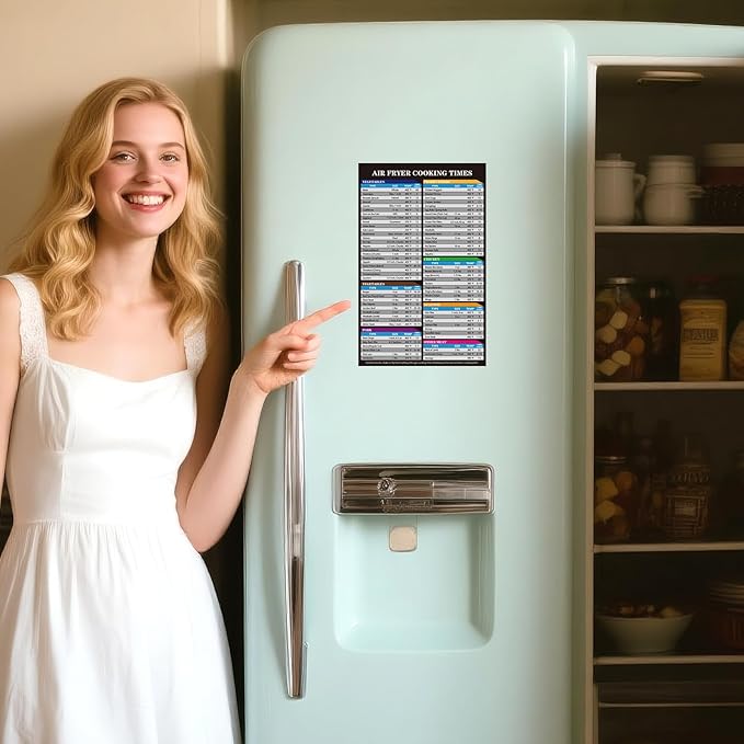 • ULTIMATE AIR FRYER CHEAT SHEET MAGNET: Our premium magnetic guide features two waterproof, oil-proof, and tear-resistant magnets (10.63"x6.69" and 5.12"x5.12") designed to stick firmly on fridges or metal surfaces. A must-have kitchen accessory.