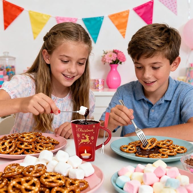 - ❆Portable Fondue Fun Anywhere❆: This chocolate melting cup is compact and lightweight, easy to carry and store, with the mug and forks fitting seamlessly together so you can enjoy rich melted chocolate or cheese anytime, anywhere. Perfect for family gatherings, parties, picnics, or camping trips, it brings delicious fondue enjoyment to every occasion.