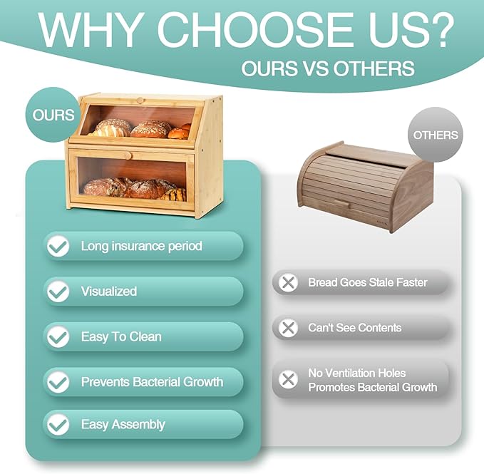 • 【Product Material】bread storage box the material is made of 100% natural bamboo,In addition We have prepared 20 packs of kraft paper bread bags as a gift for you in the packaging!and keep the bread fresh for a longer time It’s an ideal choice to store and display