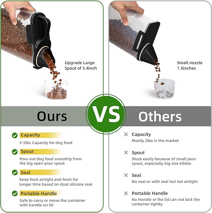 • Upgraded and Lmproved Versions:We have optimized and improved the mold the pour spout is large enough to pour out the big dog Food,You can pour out the food easy and fast now. The new upgraded Measuring Cup is also easy to screw on the spout now.The lid with snaps can also be easily closed on the barrel body.