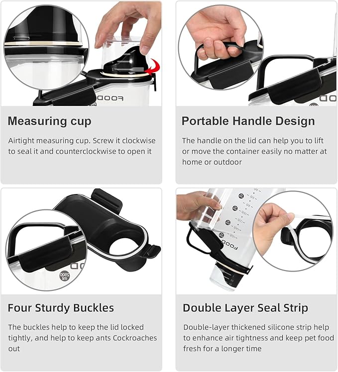 • Airtight Food Container : BPA Free Cat food bins have airtight silicone gasket and 4 snap lock latches to keep out moisture, humidity, and pests.the transparent barrel allows you to clearly see the food inside. It can not only store pet food, but is also a good choice for rice, grains, dry food, flour, brown sugar, and laundry detergent.