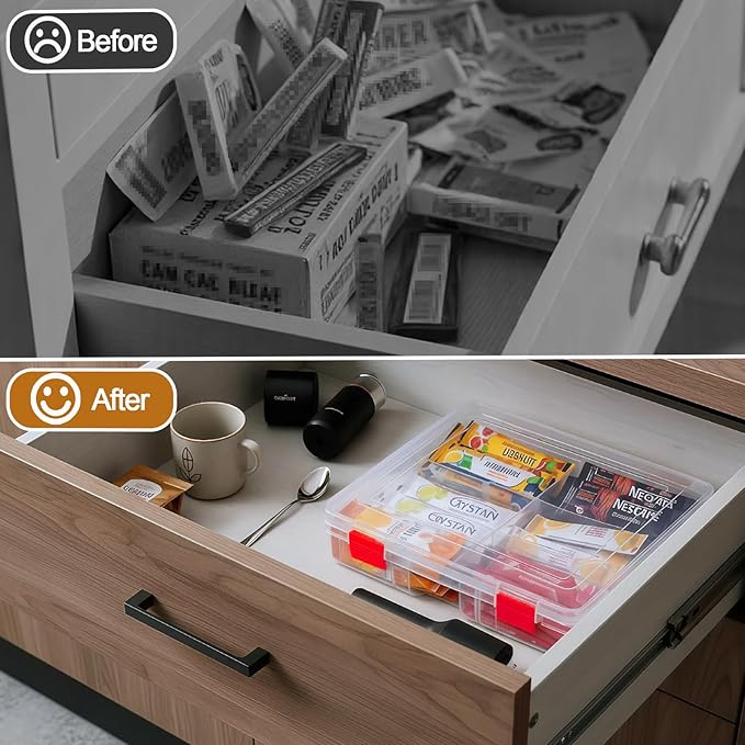 • Adjustable Dividers: This drink packet organizer comes with removable dividers, so you can customize the compartments to fit your drink packets, supplements, or powder sticks. Keep everything neatly separated and easy to find—no more messy drawers or cabinets.