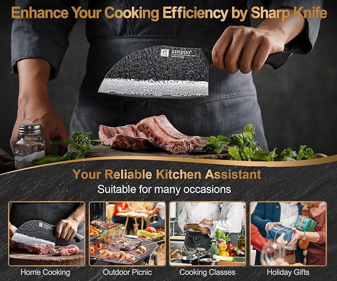 • Perfectly Sharp Blade:Features a traditional handmade wet-cutting technique with V-sharpening and a 27-degree cutting angle on each side. This bone chopping knife is a versatile kitchen tool, perfect for heavy-duty tasks such as chopping through bones, slicing meats, and cutting dense ingredients with ease; Meticulously tested for balance, it delivers the ideal combination of control and durability.