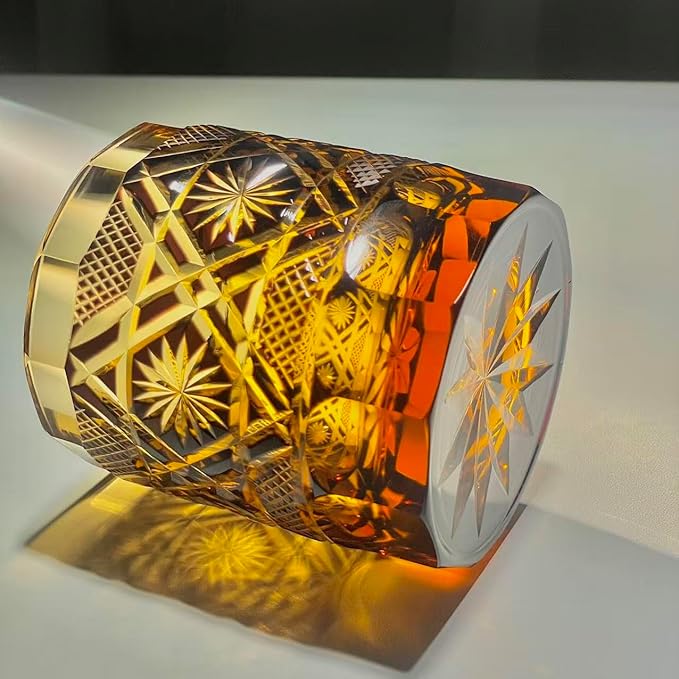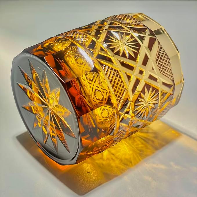 suigetsu Japanese Crystal Whiskey Glass, Cut Crystal Pattern, Luxury Cocktail Glassware (Red Gold Amber)