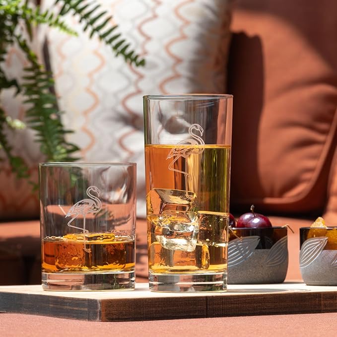 Rolf Glass Flamingo Highball Glass | 15oz Cooler Glasses | Lead-Free and Sand-Etched | Heavy Base, Thick Glass | Made in the USA | Tropical and Coastal Engraved Pineapple | Set of 4