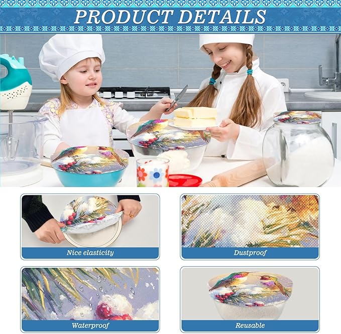 5 Pcs Bowl Covers Reusable in 5 Size Elastic Food Cover Cloth Lids Fresh Keeping Dish Cookware Bakeware Fabric Covers Lids for Food Leftovers Fruits Storage Winter Hummingbirds and Pine Tre