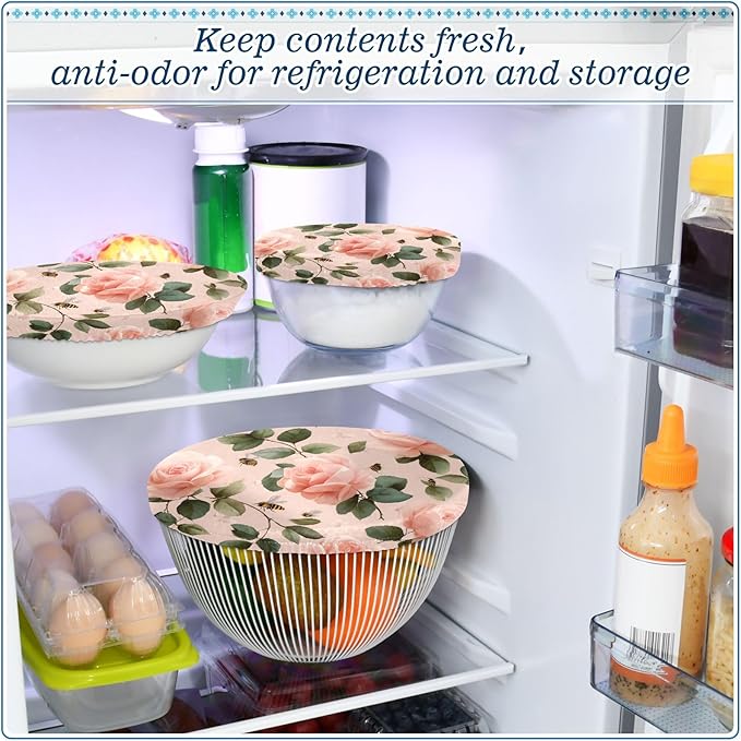 5 Pcs Bowl Covers Reusable in 5 Size Elastic Food Cover Cloth Lids Fresh Keeping Dish Cookware Bakeware Fabric Covers Lids for Food Leftovers Fruits Storage Pastel Pink Rose and Honeybees
