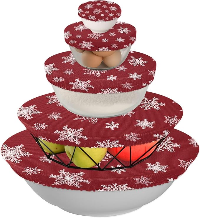 5 Pcs Bowl Covers Reusable in 5 Size Elastic Food Cover Cloth Lids Fresh Keeping Dish Cookware Bakeware Fabric Covers Lids for Food Leftovers Fruits Storage Christmas Red Snowflake