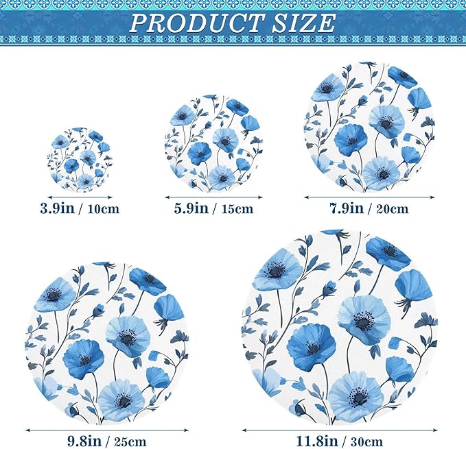 5 Pcs Bowl Covers Reusable in 5 Size Elastic Food Cover Cloth Lids Fresh Keeping Dish Cookware Bakeware Fabric Covers Lids for Food Leftovers Fruits Storage Blue Poppy Flowers and Branches