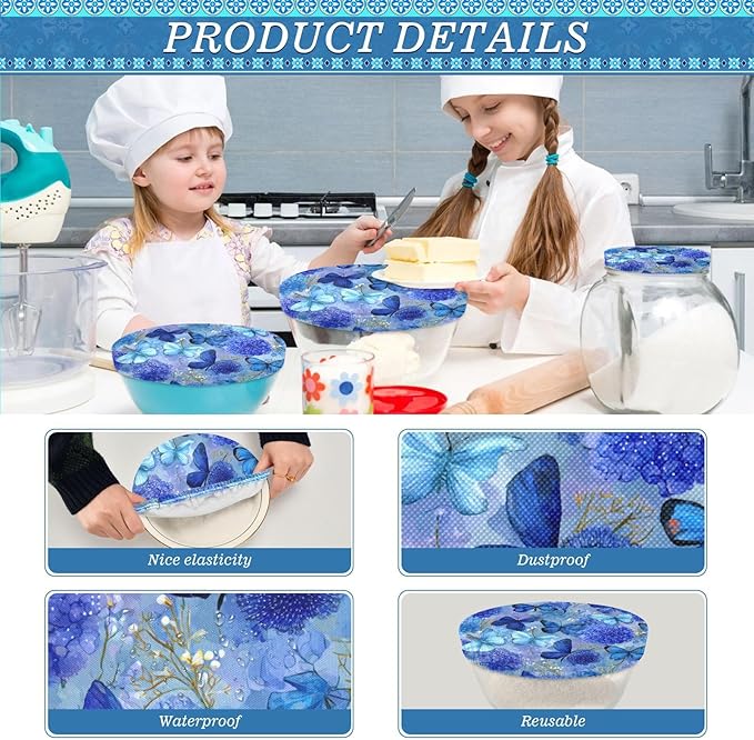 5 Pcs Bowl Covers Reusable in 5 Size Elastic Food Cover Cloth Lids Fresh Keeping Dish Cookware Bakeware Fabric Covers Lids for Food Leftovers Fruits Storage Ink Blue Hydrangea Butterfly