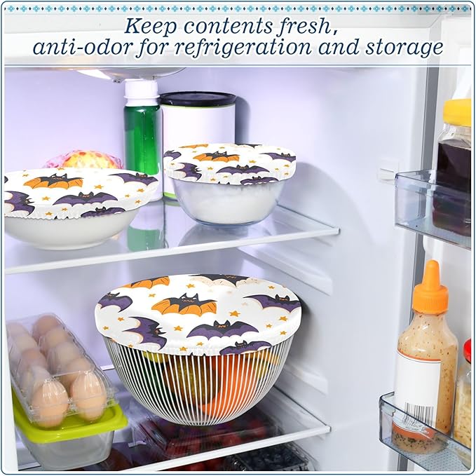 5 Pcs Bowl Covers Reusable in 5 Size Elastic Food Cover Cloth Lids Fresh Keeping Dish Cookware Bakeware Fabric Covers Lids for Food Leftovers Fruits Storage White Halloween Bats and Stars
