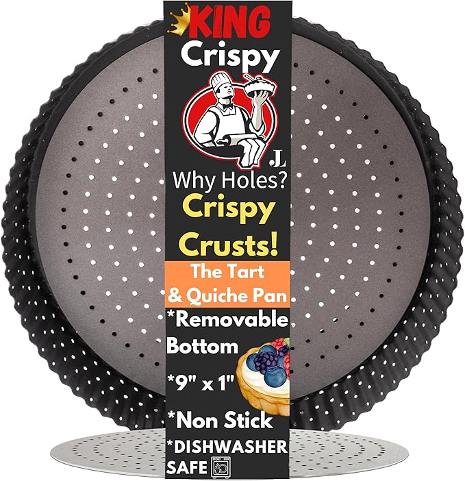Why Holes: For The Crispiest Crusts. King Crispy's Tart & Quiche Pan. A Non-Stick, Removable Bottom, Dishwasher Safe, Perforated Fruit Tart Baking Tin (9 Inch X 1.25 Inch Shallow)