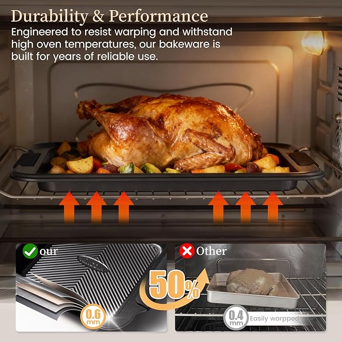 - Extra-Thick & Warp-Resistant—Crafted with 0.6mm heavy-gauge steel—surpassing the typical 0.4–0.5mm industry standard—our sheet pans for baking resist 450°F high heat without bending, ensuring even baking and long-term durability for confident, repeat use