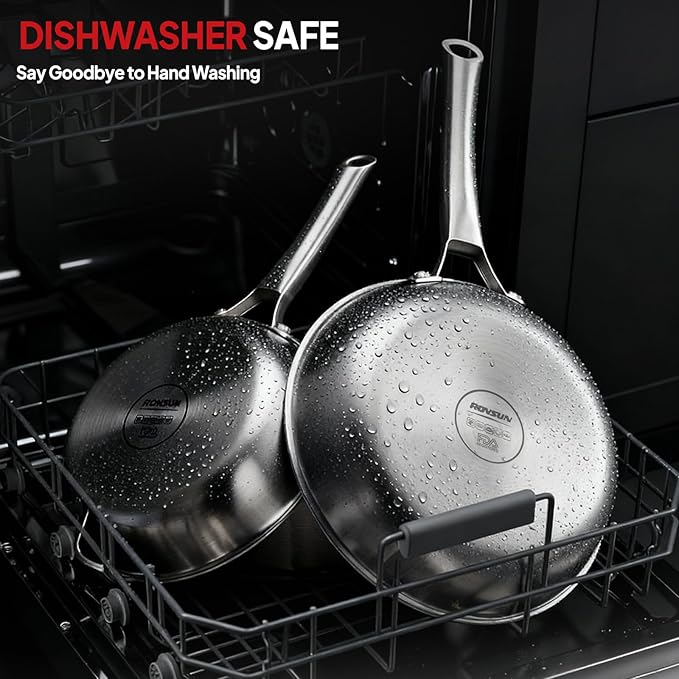 • Healthy & Dishwasher Safe: Made with non-toxic, PFOA-free polished stainless steel, it safeguards your family's health. The durable, non-reactive surface requires no coatings. After cooking, every piece is easily cleaned in the dishwasher for effortless, hassle-free cleanup.