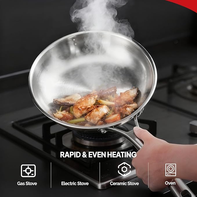 • Even Tri-Ply Heating: The professional tri-ply clad construction (stainless steel-aluminum-stainless steel) ensures superior, even heat distribution without hot spots. This allows for precise cooking, excellent searing, and efficient energy use, providing restaurant-quality results in your own kitchen.