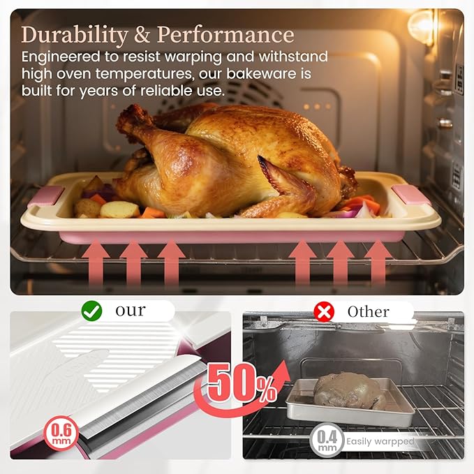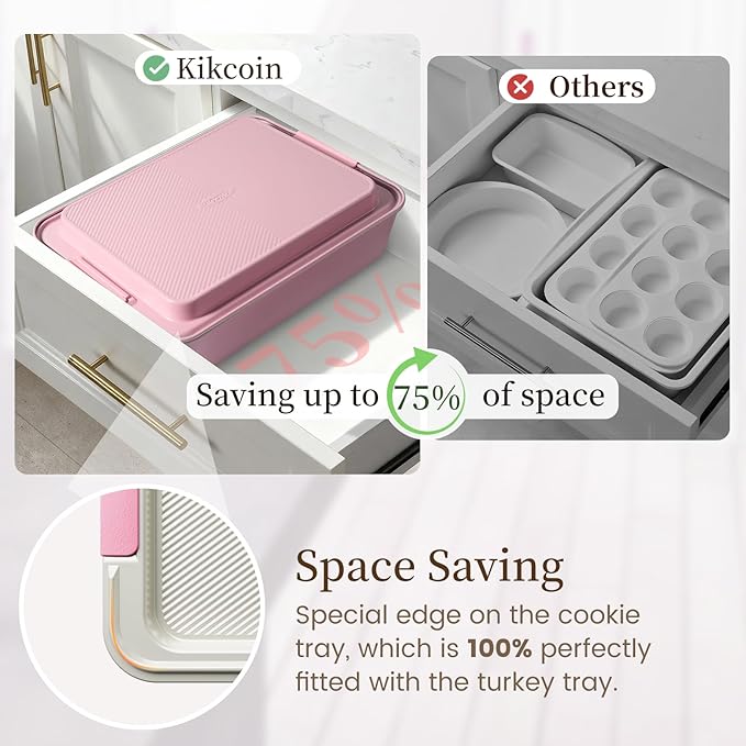 - Space-Saving Stackable Design—Features innovation tabs that securely nest each pan—from the cookie sheet to the turkey roaster—into a compact, stable unit. Unlike clumsy conventional sets that risk toppling in cabinets, our baking sheet set keeps your storage neat, safe, and effortless