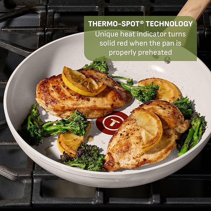 • Thermo-Spot Technology: Our unique heat indicator turns solid red to show when the pans are perfectly pre-heated. This cookware also features an even heat base that prevents hot spots for optimal cooking results