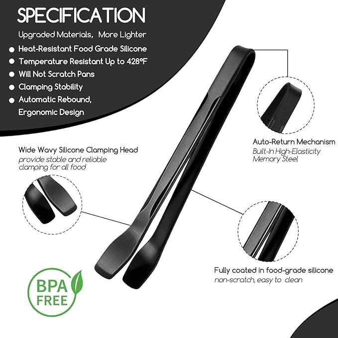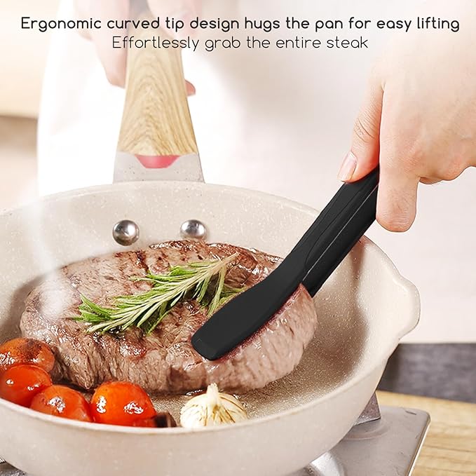 • Lifted-Head Silicone Tongs with Non-Slip Grip – Specially angled tips hug pan surfaces, securely gripping everything from slippery noodles to delicate fish fillets. Perfect as silicone tongs for cooking when flipping steaks, serving salads, or handling hot baked goods without scratching non-stick pans.